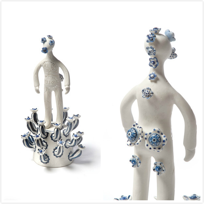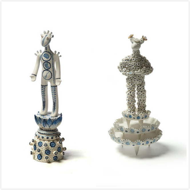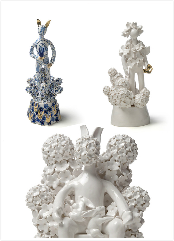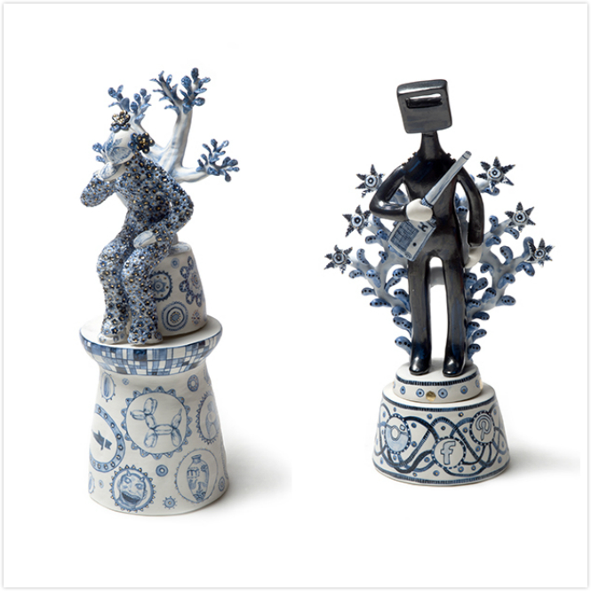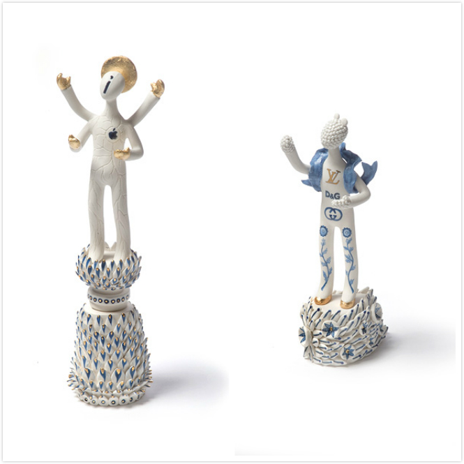 这个系列12件作品,统一的白蓝色调,部分以金色点缀,是艺术家从欧洲18世纪的人偶形象出发,用东方艺术手法塑造出的不分性别和面部特征的陶瓷人偶。这些人偶或站或坐,有些骑坐在神话怪兽背上,人偶背后则点缀着植物、树枝、贝壳、鲜花、书本等小装饰。为了点明系列名称,这十二个人偶代表了赚取一百万获得成功的十二个步骤,每个步骤的人偶与身后的装饰细节都非常逼真,以小见大,讽刺了社会媒体、名流和社会体制的无节制膨胀。