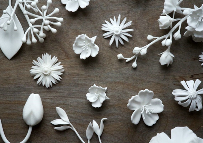 从首饰设计的手绘草图开始,Kasia Wisniewski先用3D建模软件进行设计稿的数字绘制,随后将建好的模型图导入3D打印机,用尼龙材料进行打印。打印过程中,尼龙材料在选择性激光烧结术 (Selective laser sintering, SLS)下,被激光逐层照射,从而使的尼龙粉末熔接粘合,从而堆叠为三维首饰。尼龙材料延展性高,重量小,而且可以很好地体现首饰设计的细节表达,所以设计师常常用它来呈现一些头饰作品(如下图中的兰花花冠头饰)。