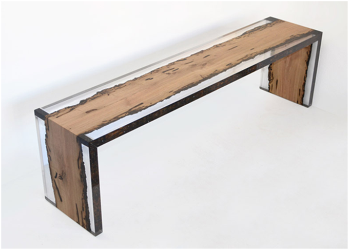 这个系列呈现了水中的木头横截面的独特工艺,超越普通的感知,有些作品还呈现了阳光经海水过滤所产生的效果,用海蓝宝石树脂和气泡填充木头的内部空隙,使木材呈现出原始的模样,保持了水下截面的样貌,显得坦白诚恳,有时日赋予的斑驳,却掩不住内心坚实的韧劲,乍看海中光影琉璃,一片光影斑斓。