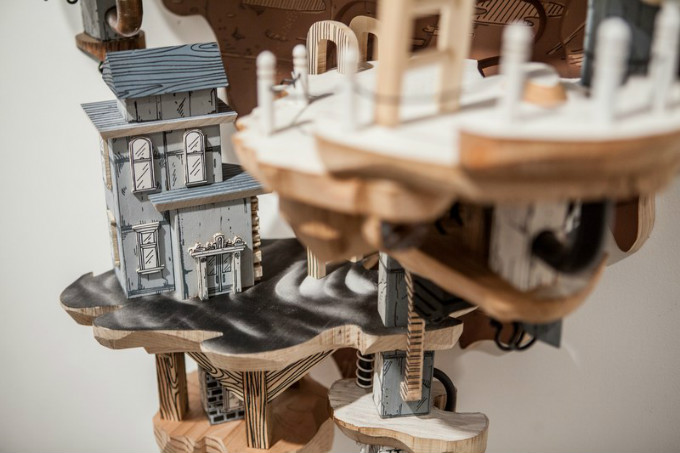 他利用丝网印刷将他绘制的二维城市风貌印在木板上,伫立起那看似繁华的城市。上方二维的城市苍白无力,而下方是充满着活力和生机木雕。低矮的老房子,生锈的金属管道,水桶,各色楼梯和围栏,和上方的高楼大厦相比,似乎地下的世界更别具风味。