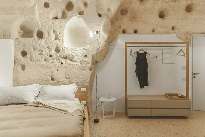 酒店的每间客房都保留了石窟的风格和特点,为了将千年石窟的历史厚重感与现代感相结合,Manca团队将凝灰岩(火山灰制成的岩石)和意大利白色石膏混合,涂抹墙壁。光滑洁白的石膏与粗糙灰暗的凝灰岩完美结合在一起,带着石窟墙壁原本的粗糙感,也实现最大程度的室内采光。