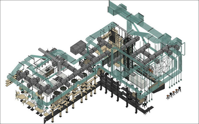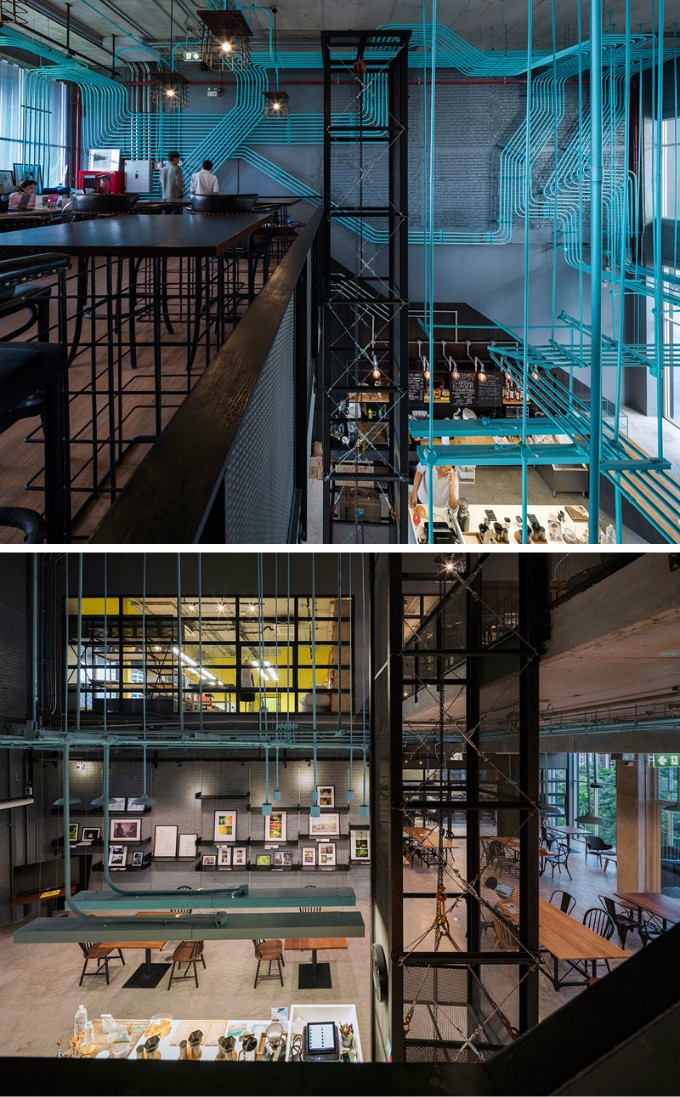 这就是他们的设计,被涂成蓝绿色的机电线贯穿整个的室内空间,一气呵成的复杂组织让人想起崇尚精密逻辑的机械美学。在这个方案中,电气管线不再被当做应被隐藏的部分,设计师故意增加了它们的数量以形成一种空间中的“马太效应”。明亮的颜色强化着这些管线给人带来的视觉冲击,带着点儿未来感,又不失典雅、清新。曾经被设计师们避之不及的设备管线反而在这里成为了空间特色,人们的视线不由自主地就会跟随着这些包围空间的线性元素。