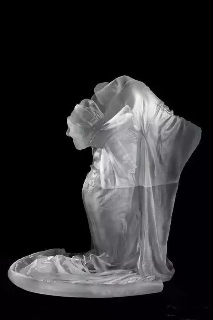 凯伦使用流传了5000年的铸造工艺打造了这些美轮美奂的水晶玻璃礼服,早期她采用吹制玻璃的手法制作雕塑,后期的便选择浇铸琉璃的方法成型。