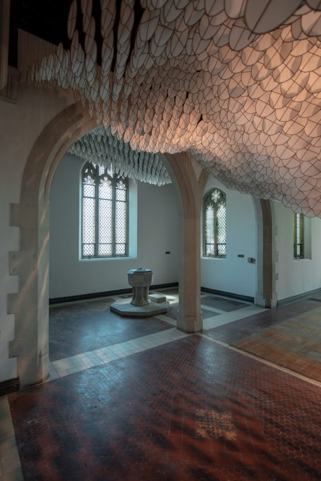 在第57届威尼斯双年展期间在法兰吉尼宫首次展出后,艺术家雅各布•桥本(Jacob Hashimoto)创作的作品“日食”又被搬到了加弗纳斯岛圣科尼利厄斯礼拜堂内,纸球由一段段的绳子悬挂在天花板上,组成了一层一层的形状,看起来像飘动的波浪或云。