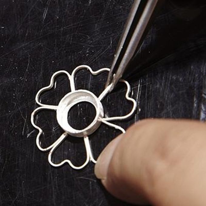 由于花丝镶嵌基本上是用金银丝制成,因此也叫做“细金工艺”,一根根细散的花丝要打造成完整的花丝镶嵌作品,依靠的是堆、垒、编、织、掐、填、攒、焊共八大工艺,而每种工艺实际操作起来又十分错综复杂。