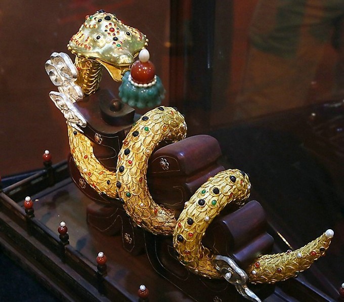 镶嵌前需将金属片以挫、锼、捶、闷、打、崩、挤 、镶等技法做成托和瓜子型凹槽,再镶上珍珠、宝石等,完成后顿时流光璀璨,金碧辉煌,比单纯的金器更能彰显皇家身份的显赫和尊贵。