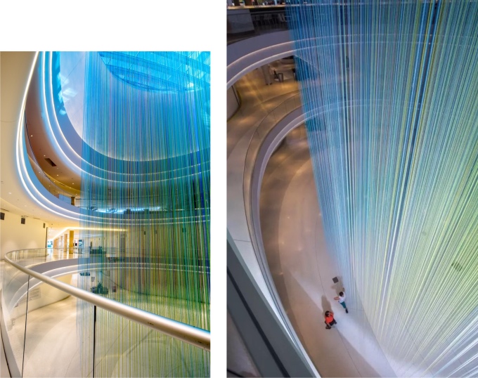除了观赏作用,Eric还用纱线改变了中庭原来的简单格局,让游客在穿过北门后不至于一眼揭开所有包袱,增加了空间的立体感与灵动感。