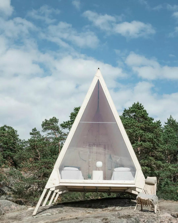 在Vallisaari岛上,有这样一座模块化的建筑,外观呈三角形,内部只有9平方米大小。从芬兰赫尔辛基乘坐轮渡,只需要9分钟就能到达这座小岛。