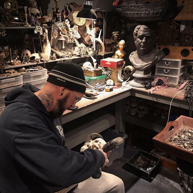 在Stieva还没有做全职纹身师的时候,几乎所有的时间都花在车间里或寻找材料。在Jason Stieva22岁的时候,他买了人生中第一辆灵车,并收集了大约20年的尸检文物,比如:棺材、人头骨、标本、奇怪的东西、古董医疗器械、维多利亚时代的死亡照片以及所有这些有趣的东西。这也使他的雕塑作品被赋予了黑暗的色彩。