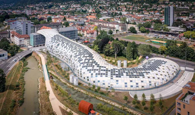 坂茂对建筑的选材格外用心,比如上图建筑,是欧米茄和斯沃琪是瑞士钟表制造的心脏,坂茂会根据每个品牌的特点明确区分建筑的设计理念,再选材。