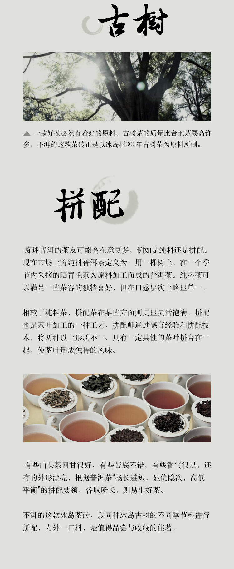 这款冰岛茶砖源自冰岛村云南大叶种300年树龄古树,融合古代劳动人民对于天文地理的思索和对自然万物的理解,才有了这款「玄月」和「曜日」普洱茶砖的诞生。