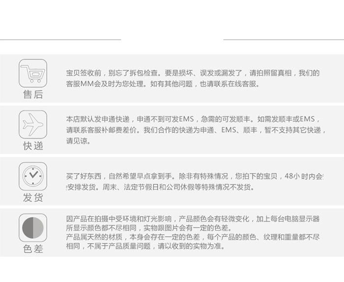 下单48小时内发货 7天无理由退换货,如果不是由于质量问题而发生的退换货,来回运费需由买家自行承担.