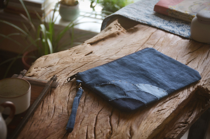 望月 植物染色 蓝染亚麻 拼布刺子 手拿包