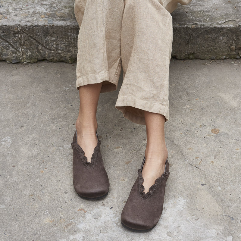 春森系复古真皮擦色皱褶花边大头套脚娃娃单鞋软底百搭单鞋