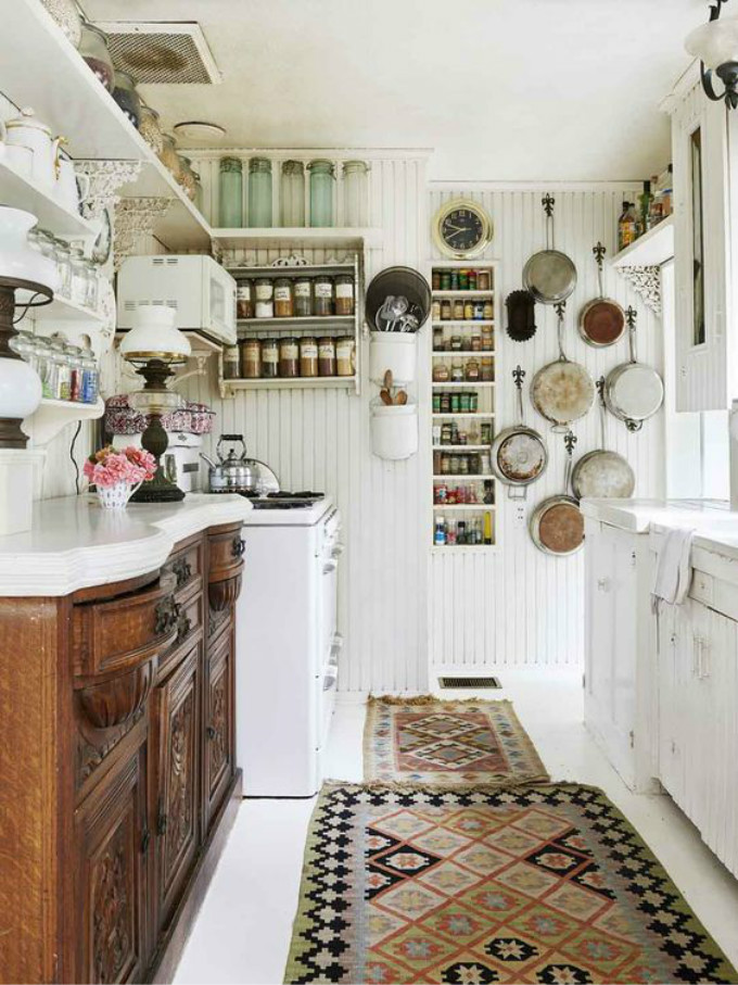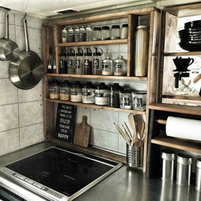 在厨房的墙壁上安置一个浅浅的壁橱,这样既不会妨碍行走又可以自己定尺寸,充分利用了空间,非常适合喜欢收藏很多调味料的女主人。再用一些绿色植物装饰在木架上,是不是十分清新自然呢?在开放式厨房里DIY一扇窗户隔开客厅,自然又透光,不但解决了空间单一的问题,和谐舒适的田园风还能使人身心放松。
