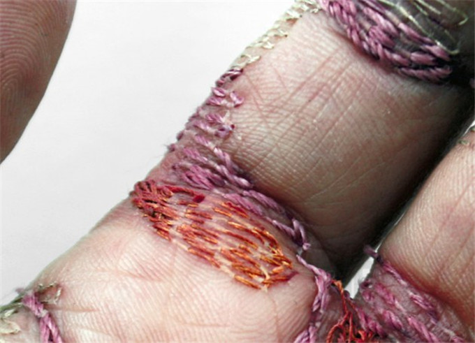 Eliza Bennett把手看作是一张画布,用针刺入皮肤将彩色丝绒线缝进皮肤角质层中,在手指上布下彩色螺纹,编织出美丽的线条与图案,完成这一系列难以置信的“受虐狂”般的刺绣画作。