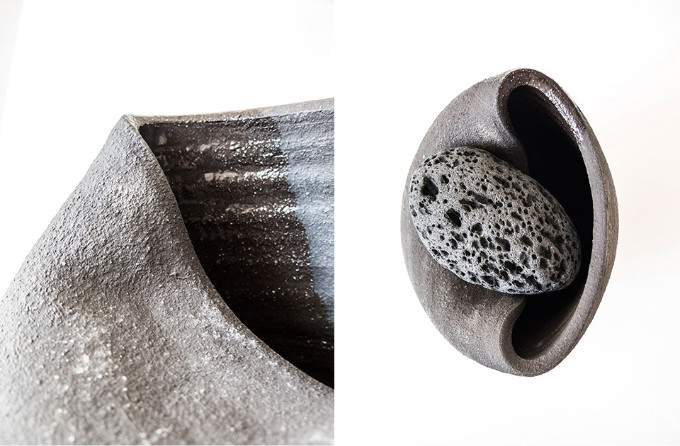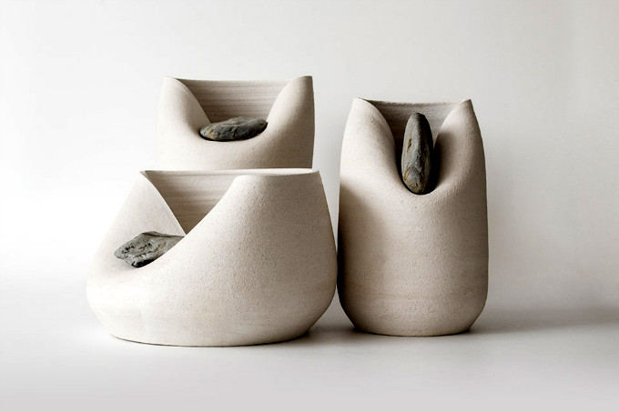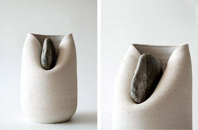粘土瓶子因受石头之力而变形,自然气息与朴实工艺交织于一体,自大地而来的石头带给陶瓷的独特自然之美,是大地与工艺对话吗?