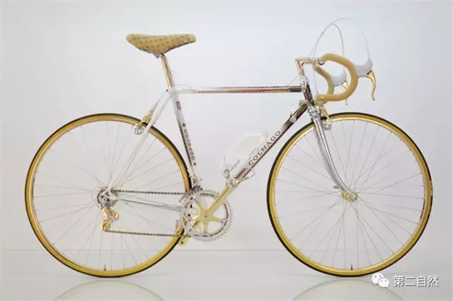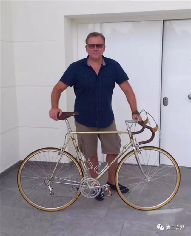 这是Javier Jubete组装的一款复古单车,还原了一款1983年的Colnago Master车架,并和他的团队在Vintage Campagnolo和Cinelli寻找零配件。加上专业定制的Campagnolo 50装备,阿比西尼亚黑色油漆及24K镀金,最后完成这个Ciocc镀金复古豪华自行车。