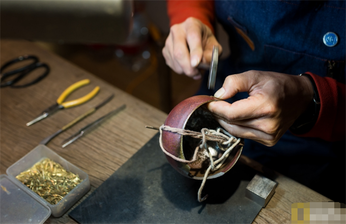 第五步用鸡蛋清和瓷粉调和补漏,防止瓷器漏水,这样完整的锔瓷就完成了。