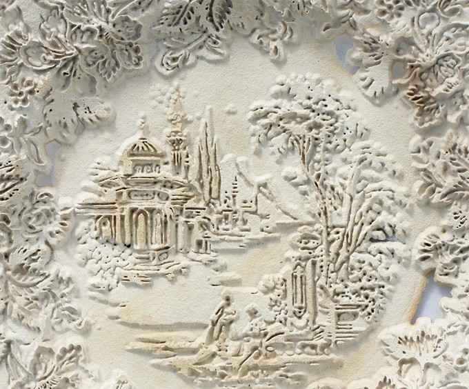 她会对盘子反复进行喷砂以去除其表面的釉料和图案,然后一点一点逐层雕刻,将二维的园林图案以三维形式立体呈现在瓷盘上。