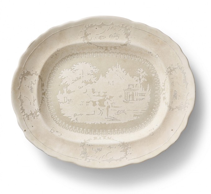 这件已经泛黄的陶瓷并没有影响浮雕的表现力,深色部分的痕迹反而凸显了树木的枝干、建筑的结构、拱桥的流线,让这座中式园林更具有年代感。