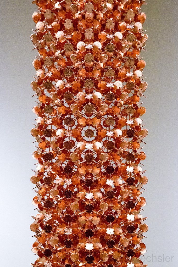 这座雕像外形借鉴了古希腊建筑中以女性雕像作为柱子的「女像柱」,使用了15000枚全新的1美分硬币,拼合成十二面体,再组合成柱体,最终的效果十分惊艳,仿佛无数朵盛开的花朵组成了这根玫瑰金色的柱体。