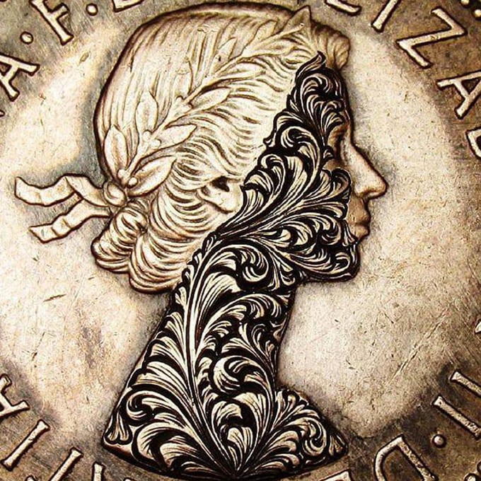 比如所有英联邦国家都曾经铸造过的英国女王头像,如今被他尝试着用自动机床雕刻出令人眼花缭乱的几何图案: