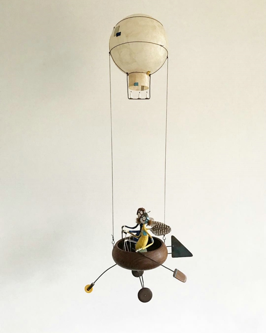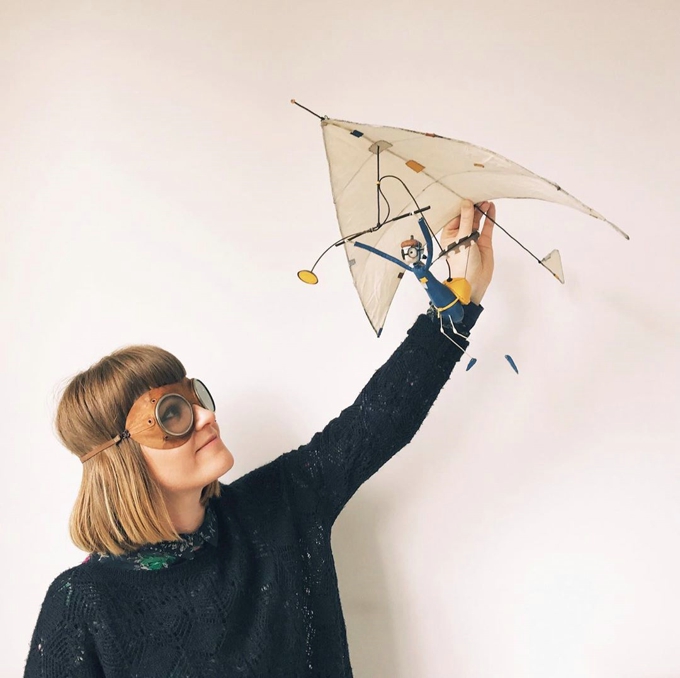 她的艺术品的主人翁是一位仙女玩偶的日常生活,经常骑在异想天开的飞行器上。