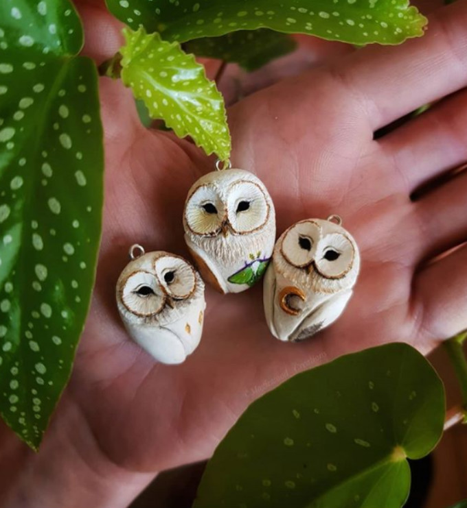 这是Alexandra画在一小片可回收木头上的谷仓猫头鹰吊坠.