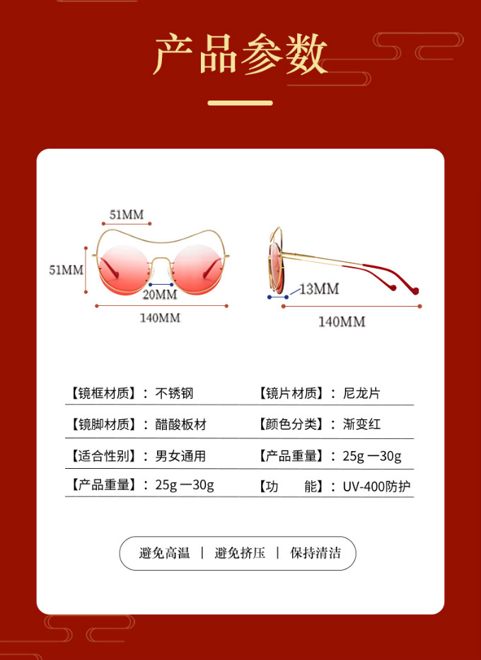 这款墨镜的设计灵感呢,来源于闹传统IP的三太子哪吒,脚踏风火轮,手握混天绫。两者作为代表性符号被我们延用至墨镜镜片及镜框的设计中,这种镜片不仅可以阻挡紫外线和红外线,同时还可使外界环境的颜色不改变,只有光线强度改变,好像阴天一样,有凉爽舒适的感觉。