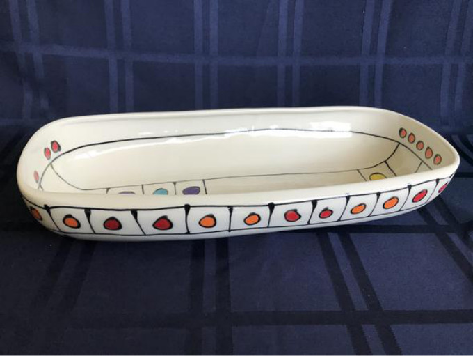 一个可爱的长方形瓷盘,上面点缀着五颜六色的圆点,非常适合作为简单的晚餐、午餐或开胃菜的碗。