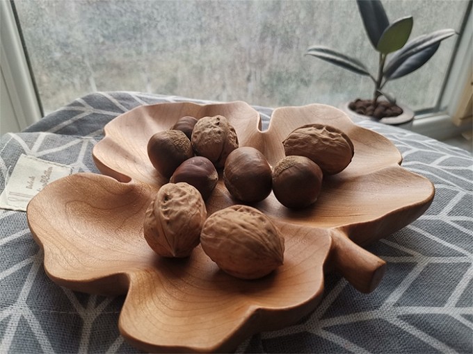 这件干果盘的材质为樱桃木实木,以手工雕刻,造型自然不呆板,发货前已做好木蜡油养护和消毒工作。