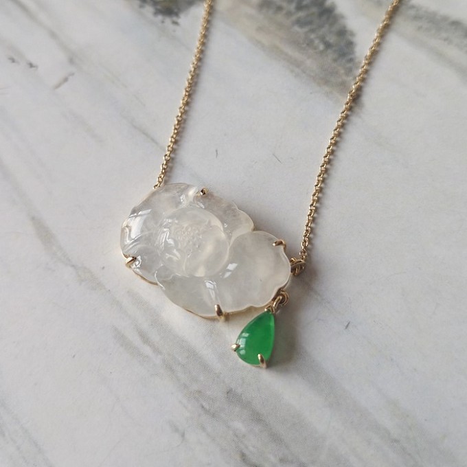 这款吊坠项链以冰种青莲与满绿翡翠为料,经过精心设计与雕琢完成设计,造型别致,清新优雅。