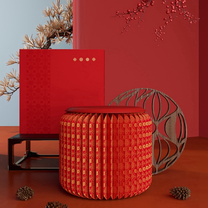 这件简约置物边几凳共有两款,分别为喜相逢圆凳和折枝花圆凳,可随处方便置物,亦可折叠如书,巧省空间。